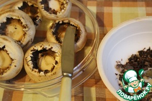 Шампиньоны внутри вычистим (удалим пластинки), нальем в каждый по чайной ложке соевого соуса.