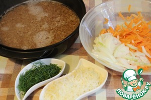 Гречневые хлопья зальем кипятком, в пропорции 1 к 2, согласно инструкции, накроем крышкой и оставим на 3 минуты. Лук нарежем тонкими четвертинками колец, морковь - на крупной терке, сыр и укроп мелко.
