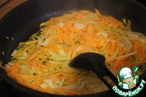На смеси масел (сливочное и оливковое) обжарим до золотистого цвета морковь и лук.