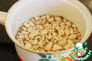 Первым делом займемся приготовлением грибного соуса. Для этого мелко нарезанные ножки шампиньонов отварим в чуть подсоленной воде 5 минут, оставим остужаться.