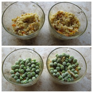 Разложить подготовленную основу запеканки по порционным формочкам или в одну большую форму (форму предварительно смазать маслом и посыпать сухарями), сверху выложить слой зеленого горошка.