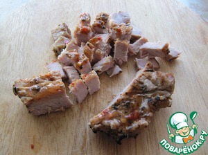 Готовое мясо (можно заменить сосиской, ветчиной) нарезать кубиками.