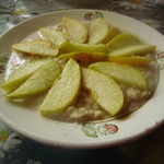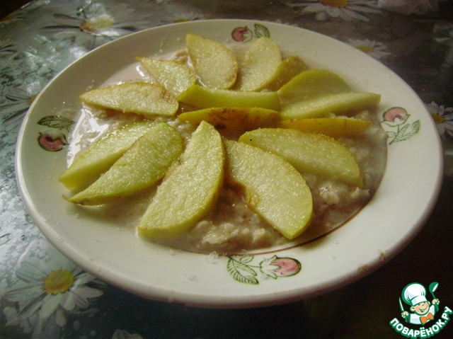 Залить хлопья, накрыть и оставить. В это время яблоко нарезать тонкими ломтиками. Тут можно дать волю фантазии: вместо яблока использовать грушу, банан, различные ягоды или смесь этой полезной вкуснятины