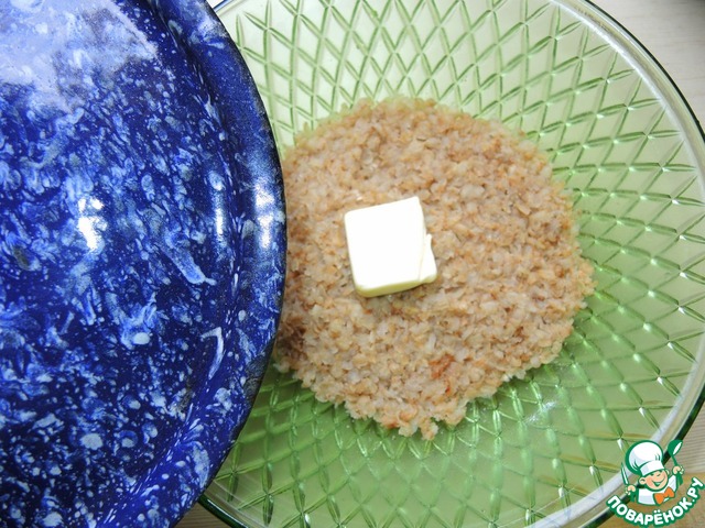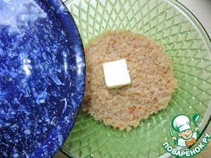 Положить сверху кусочек сливочного масла и накрыть крышкой, дать разбухнуть 7-9мин. Посолить и взрыхлить вилкой.