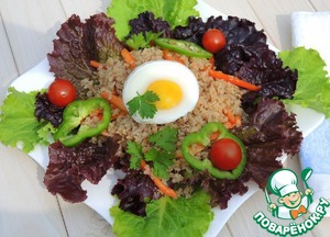 На порционную тарелку выложить листья салата. Красный болгарский перец нарезать тонкой соломкой и перемешать с гречкой, выложить на листья салата. Вокруг положить колечки зеленого болгарского перца, помидорки черри и зелень, сверху выложить яйцо.
