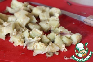 Баклажан переложить в посуду, пригодную для СВЧ. Готовить на мощности 850 Вт 5 минут до мягкости. Дать остыть. У баклажана снять кожуру, мякоть нарезать кубиками.