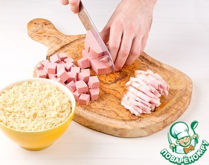«Грудинку Столичную» нарезать соломкой. Колбасу «Докторскую черкизовскую» нарезать кубиками.