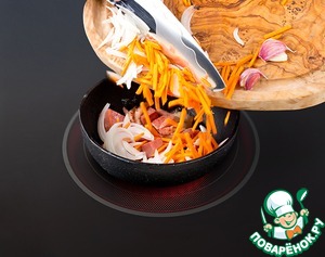 В сковороду с колбасой и грудинкой добавить нарезанные репчатый лук, морковь, раздавленный ладонью зубчик чеснока, специи и обжаривать 3 минуты.