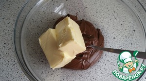 Когда бисквит уже почти готов, приступайте к приготовлению крема. Смешайте шоколадный крем Нутелла со сливочным маслом.