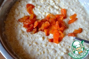 Взбиваем яйца, сметану, сахар, соль, соду и творог. Добавляем нарезанную курагу.