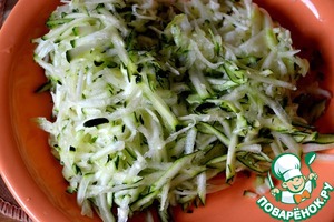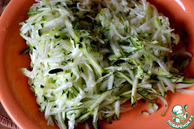 Крупно натираем кабачок. У меня молоденькие цуккини, натираю сразу с кожей.