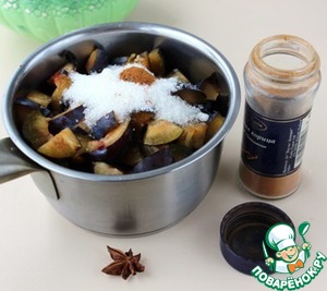 Выложить в чашу для СВЧ, добавить сахар, корицу, звездочку бадьяна.