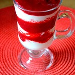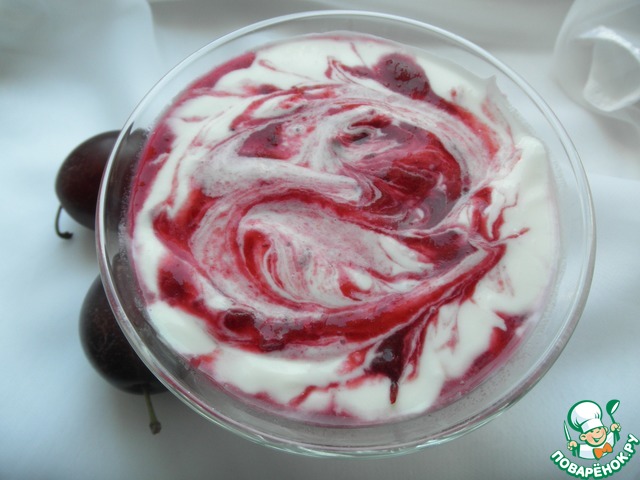 В креманку, чередуя, выкладывать ложку творожной массы, ложку сливового пюре