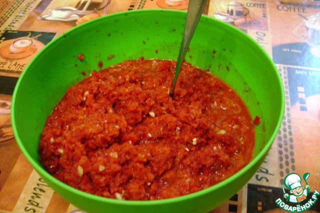 Перекрутить на мясорубке перцы с чесноком, один раз.