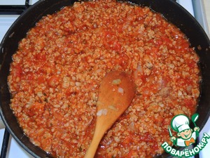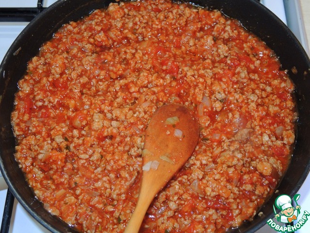 • Добавить к обжаренному фаршу соус болоньезе (у меня готовый, но его можно заранее приготовить и самим), потушить еще 5-7 минут.