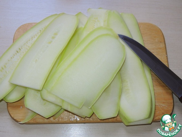 • Молодой кабачок нарезать тонкими пластинами. Нужен именно молодой кабачок, т. к. из старого придется вырезать семена и пластины не получатся широкими.