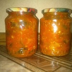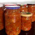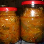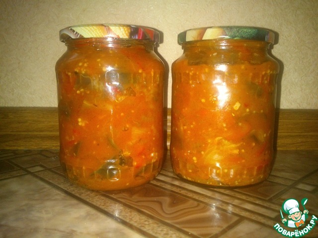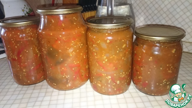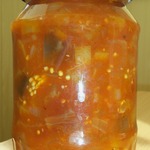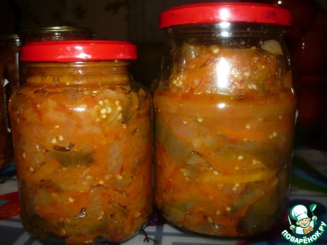 Банки простерилизовать, залить в них горячий салат и закатать. Поставить банки на крышки и укутать в одеяло на ночь. Утром банки можно убирать в кладовку или сразу наслаждаться вкусным салатом. Выход: 4 литра