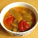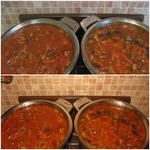 Овощи закладываем в большую кастрюлю, заливаем разведенным соком и ставим на средней огонь, периодически помешивая. -