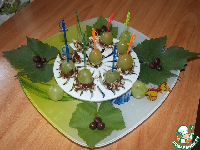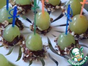 • Виноград разделить на ягодки. Каждую ягоду на половину одеть на шпажку, обмакнуть в растопленный шоколад, затем в орехи. Убрать на 5-10 минут в холодильник.