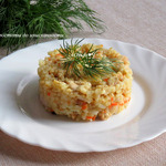 Когда рис будет готов, вынуть головку чеснока и выбросить ее.