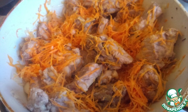 Когда мясо достаточно обжарилось-добавляю мелко порезанный лук, обжариваю. Затем туда же морковь (я тру на мелкой терке). Как морковь пустила сок-отключаю.