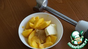 Тем временем измельчаем с помощью блендера одно некрупное манго, 50 мл молока, 20 гр сливочного масла 2 ст. л. сахара.