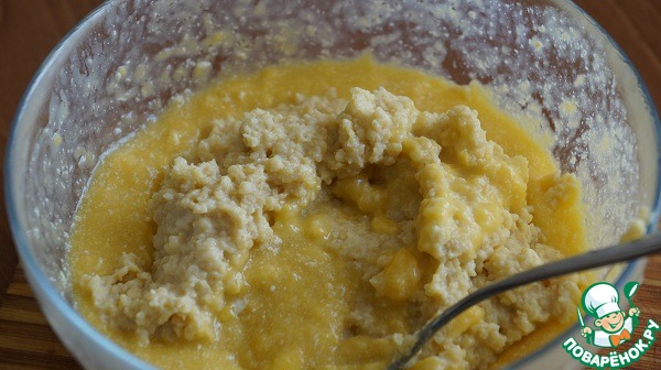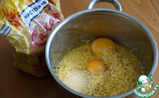 • К хлопьям добавляем 2 некрупных яйца, примерно 2 ст. л. сахара