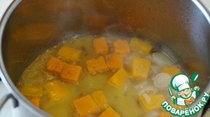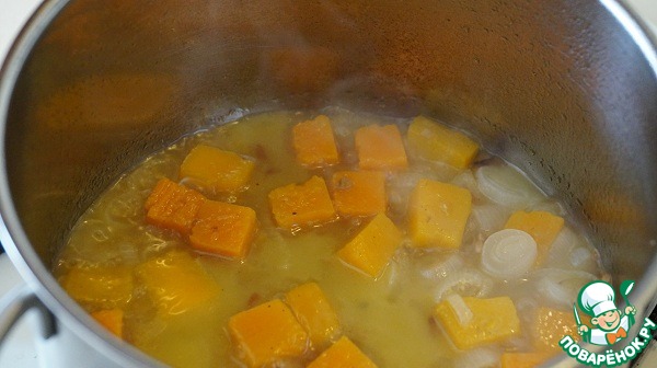 Примерно 150 гр. тыквы, половину небольшой луковицы и два ломтика бекона (или подкопченного домашнего сала - для аромата) режем мелкими кубиками
