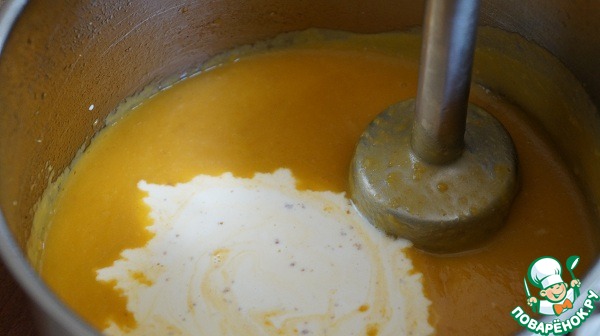 Тыква готова, измельчаем ее блендером до гладкого и однородного состояния, вливаем сливки - примерно 100 мл. Жирность - 10%.
