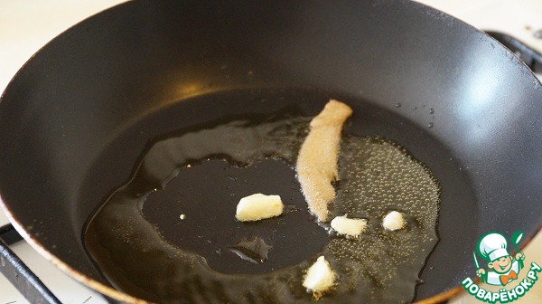 Тем временем в сковороду наливаем оливковое (растительное) масло, кладем один раздавленный зубчик чеснока и маленький ломтик имбиря.
