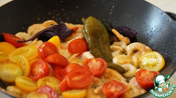 Добавляем горсть нарезанных томатов черри ( у меня красные и желтые), перемешиваем и регулируем соль.