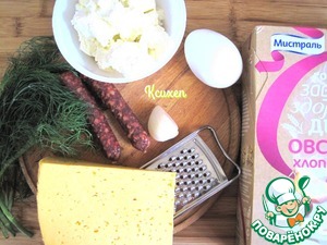 Охотничьи колбаски нарезаем тоненькими кружочками, сыр натираем на мелкой тёрке. В отдельной мисочке творог смешиваем со сливками до однородной, гладкой консистенции. Зелень мелко режем.