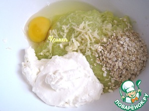 В отжатые кабачки добавляем овсяные хлопья, творог, яйцо, половину нарубленной зелени. Всё перемешиваем. Солим и перчим по вкусу. Для более копчёного вкуса я добавила немного копчёной паприки. Если масса слишком жидкая, добавляем 1-2 столовые ложки муки и снова всё перемешиваем.