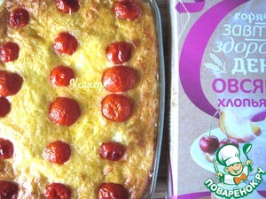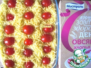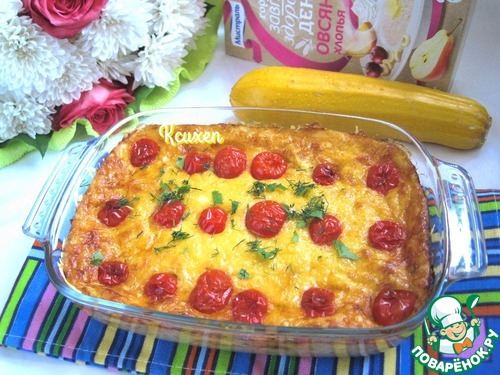 Далее выкладываем оставшуюся кабачковую массу, оставшийся сыр. Помидорки черри разрезаем пополам и украшаем ими будущую запеканку.