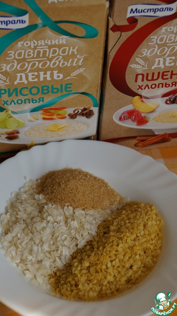 Смешиваем по 50 гр рисовых и пшенных хлопьев, добавляем 1 ст. л. сахара (я взяла коричневый - для придания карамельного привкуса)