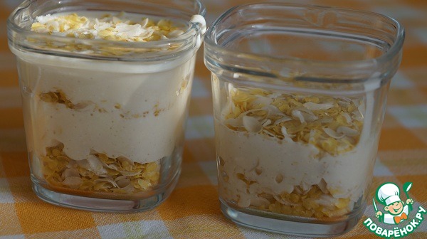 затем снова слой хлопьев, на них опять творожно - зефирная смесь. -