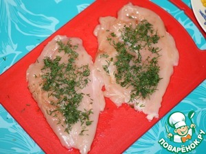 Пока варится кукуруза займемся промаринованной курочкой. На каждый пласт грудки выложить по 1 ст. л. рубленного укропа,