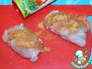 и аккуратно заворачиваем курочку рулетиком. Посыпаем приправой для курицы. Чтобы не повредить мясо, можно скрепить рулеты зубочисткой или кулинарной нитью. Выложить рулеты в разогретое растительное масло и жарить с двух сторон до золотистого цвета.
