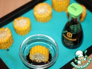 Разрезаем кукурузу на порционные кусочки. Макаем кусочки кукурузы в чесночный соус и выкладываем на противень. Противень ставим под гриль на 5 минут. Почувствовали аромат, вынимаете кукурузу, готова! -