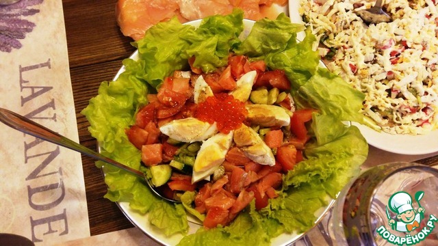 Свежий, летний салат с пикантной ноткой слабосоленой семги.