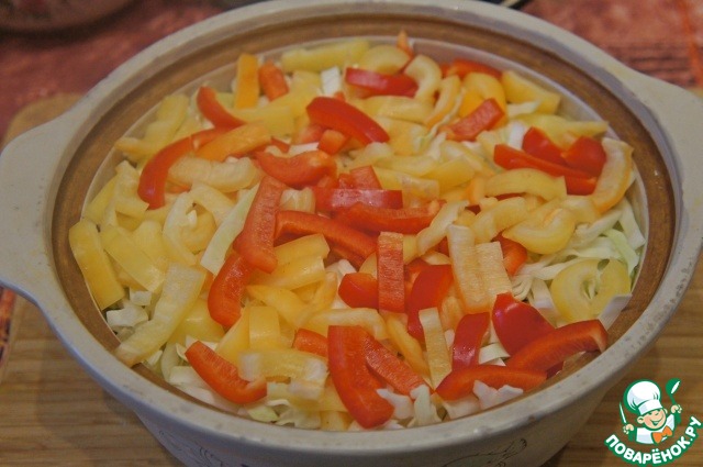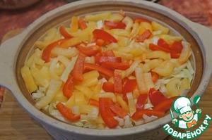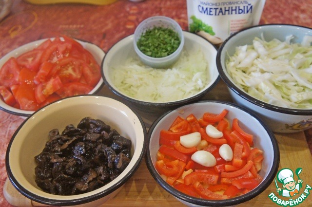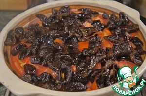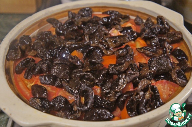 Подготовить овощи, почистить. Лук нарезать полукольцами, капусту нашинковать. Помидоры и перец нарезать дольками. Чернослив размочить в течение 10 минут в горячей воде и разрезать пополам.