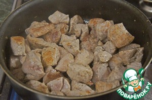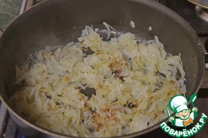 Лук обжарить до легкой румяности, вынуть из сковороды и временно отставить.