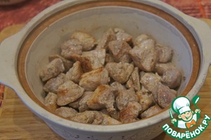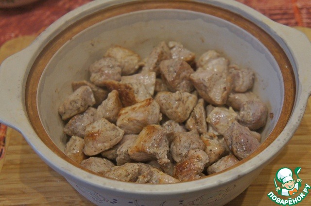 На мясо выложить лук (его, кстати, можно и не обжаривать).