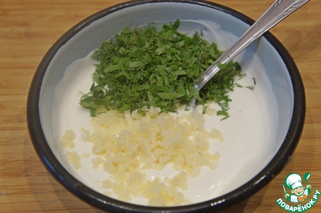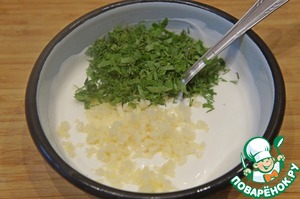 Смешать майонез и сметану с измельченным чесноком и зеленью,