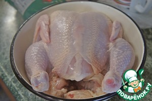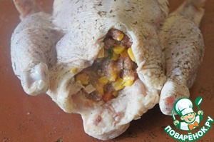 Начинить курочку, отверстие зашить или заколоть зубочисткой.