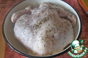 Растопить сливочное масло, смешать с пряностями и обмазать курочку.