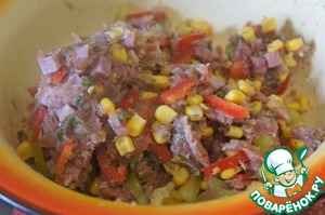 Тем временем в фарш добавить кусочек копченой грудинки, нарезанной кубиками, хорошо размешать. Добавить кукурузу, муку, сухую приправу по вкусу, нарезанный соломкой перец.
