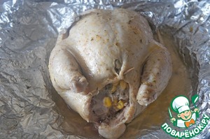 Не знаю, почему так называется этот рецепт. Может из-за того, что в начинке содержится кукуруза. Готовила сразу две, в поезд. Одну для дочери с зятем и внучками, они ехали в Новороссийск. Другую для себя и подруги, мы ехали в Москву. Понравилась курочка всем.