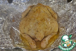 Затем вынуть курочку из духовки, осторожно развернуть фольгу и снова слегка смазать её маслом с пряностями.