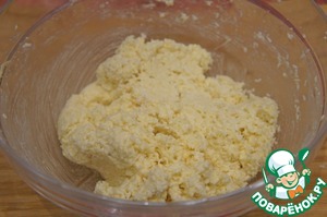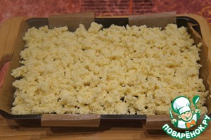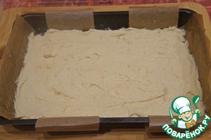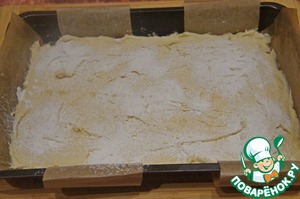 Форму (у меня прямоугольная 20х30 см) застелить пекарской бумагой, которую слегка смазать маслом. На дно выложить песочное тесто, разровнять руками.